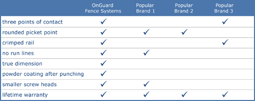 - Unlike some other brands, all OnGuard Fence Systems' rails and posts are powder coated after punching and notching, re-sealing all exposed surfaces with a protective powder coat finish for long-lasting quality.